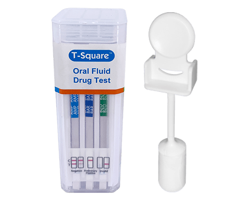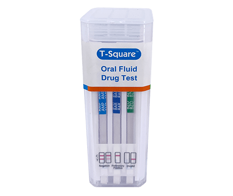 - 5 Panel (No-THC) T-Square™ mouth swab drug tests (25/Box) *with indicator are approved for workplace drug screening. Tests for: Amphetamine (AMP), Cocaine (COC), Methamphetamine (MET), Opiates (OPI), PCP.